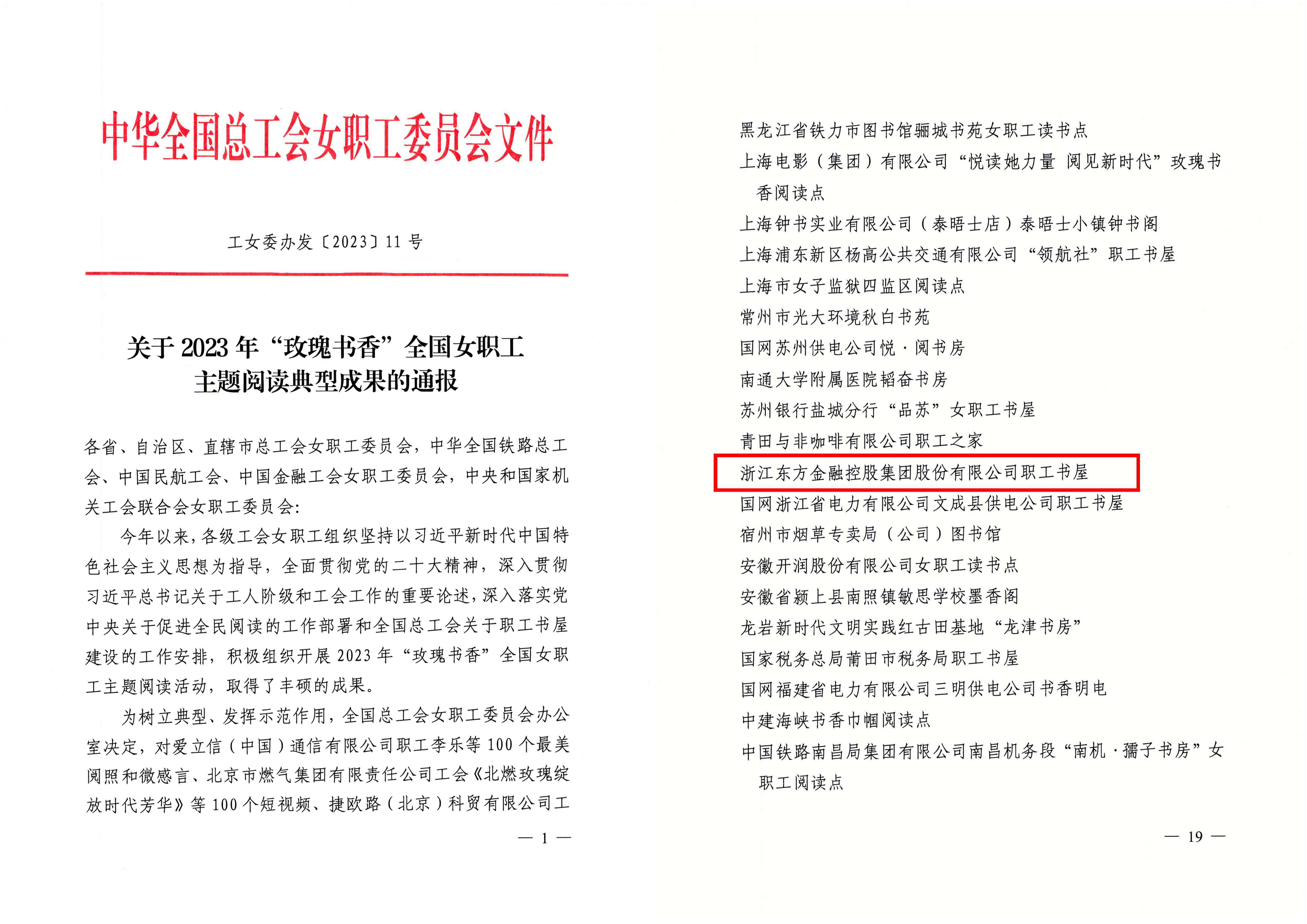 近日,中華全國總工會女職工委員會發(fā)文公布2023年“玫瑰書香”全國女職工主題閱讀典型成果名單,浙江東方職工書屋獲評全國一百個“玫瑰書香?最美女職工閱讀點”之一。此次評選是全國總工會女職工委員會為樹立典型、發(fā)揮示范作用,深入落實黨中央關于促進全民閱讀工作部署和全國總工會關于職工書屋建設工作的重要內(nèi)容。